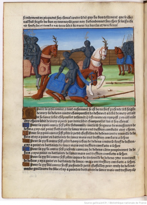 Messire Antoine, bastard of Brabant, was preceded by a man on horseback dressed in yellow who was led by a great giant with a wild man flanking him on each side; on his helm was a clutch of fine feathers and, on top of that, a crimson crest laden with gold decorative elements. His horse's caparison was of blue velvet wth a border of gold thread, golden teardrops and little silver bells shaped like pears; sitting on top of the horse's rump was a large, round-shaped bell. The knight broke his lance but Messire Antoine didn't; the knight managed twenty-seven strokes with the sword and Messire Antoine fourteen. [...]